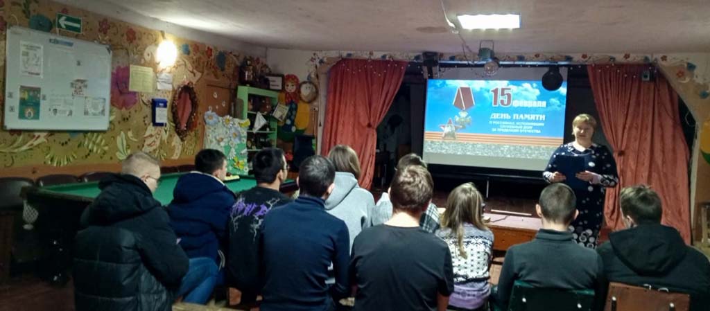 15 февраля День памяти о россиянах, исполнявших служебный долг за пределами Отечества» — официальная памятная дата в Российской Федерации, призванная почтить память воинов-интернационалистов, исполнявших интернациональный долг за пределами границ своей Родины. В этот день на всех сельских киноустановках прошли тематические показы художественных и документальных фильмов «Я – Родины солдат».