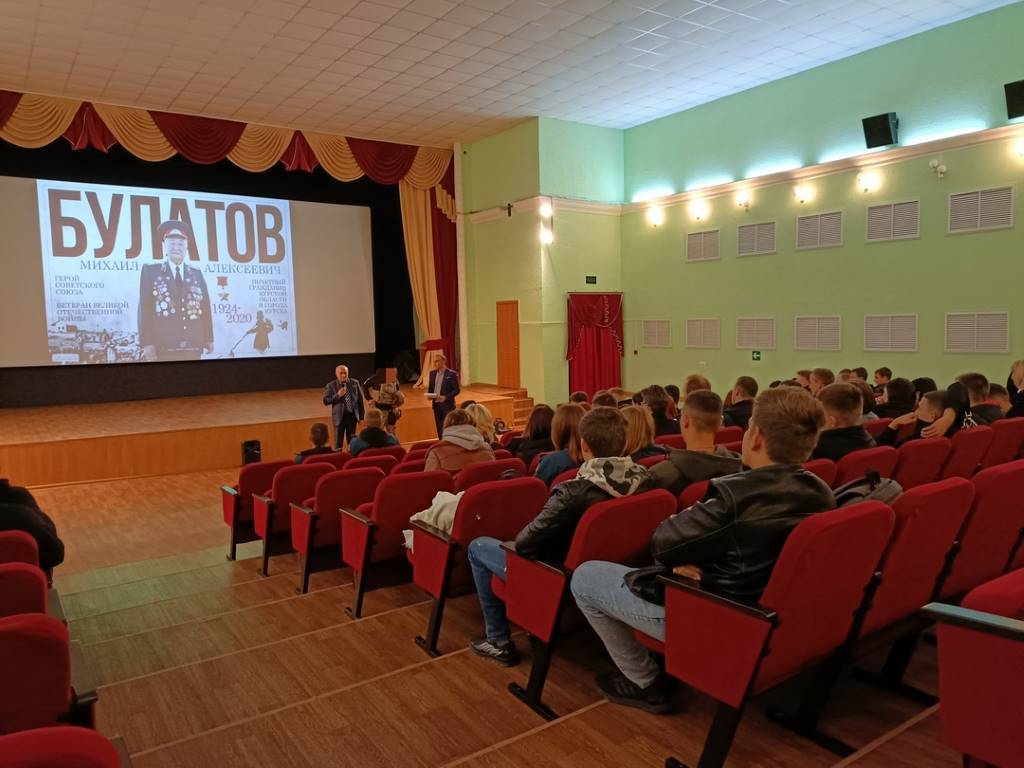 Владислав Дмитриев рассказал историю жизни и подвигов нашего Героя. Главный свой подвиг Михаил Алексеевич Булатов совершил при прорыве обороны Кенигсберга в апреле 1945 г. В труднейшей обстановке, под огнем противника сапер вывел из строя 24 авиабомбы, открыв путь нашим войскам.Указом Президиума Верховного Совета СССР от 19 апреля 1945 г. за героизм в боях в Восточной Пруссии старшему сержанту Михаилу Булатову было присвоено звание Героя Советского Союза с вручением ордена Ленина и медали «Золотая Звезда». Награду отважному 20-летнему солдату вручал командующий 3-м Белорусским фронтом маршал Василевский.