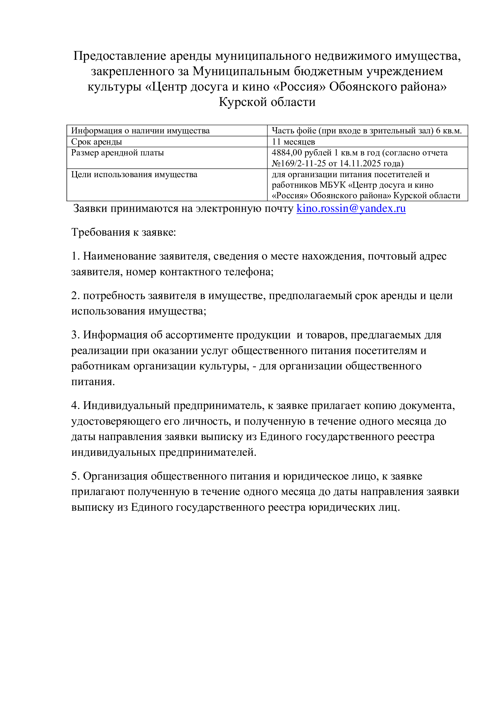Предоставление аренды муниципального недвижимого имущества, закрепленного за Муниципальным бюджетным учреждением культуры «Центр досуга и кино «Россия» Обоянского района» Курской области